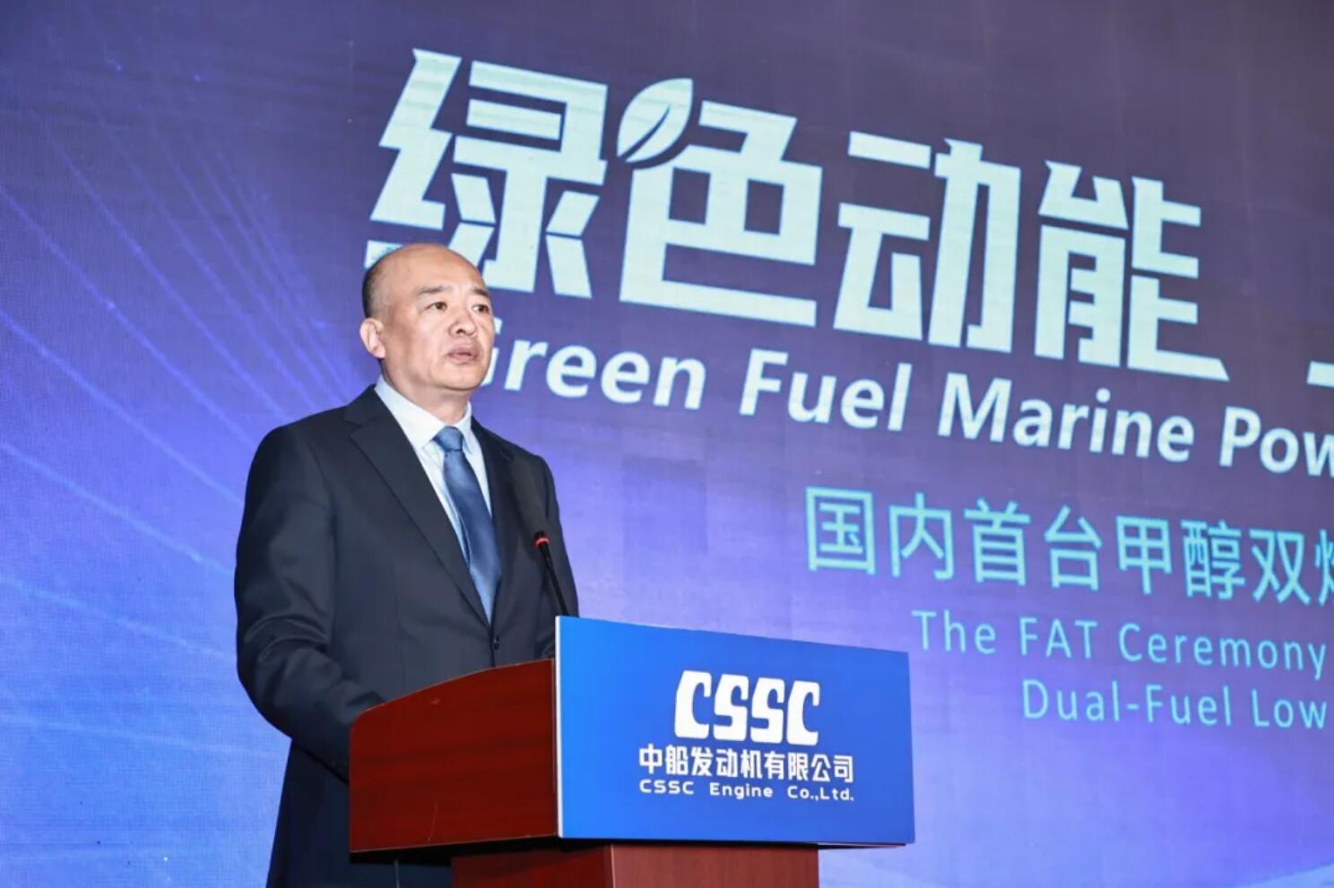 中船發動機黨委書記、董事長付向昭熱情洋溢的歡迎辭拉開了交機儀式的序幕,在中船發動機黨委副書記、總經理楊小強的主持下,集團主管部門領導、BV船級社和船廠代表分別致辭,中國船舶集團綜合技術經濟研究院副院長包張靜作《綠色船用動力發展趨勢與市場機遇》報告,中船發動機黨委委員、副總經理陳義仿介紹了中船發動機低碳零碳發動機布局及國內首臺甲醇雙燃料低速機的研制過程。隨著推桿儀式的成功完成,整個交機儀式被推向了高潮,現場氣氛熱烈高漲,與會嘉賓一齊鼓掌,慶祝國內首臺甲醇雙燃料低速機成功交驗!