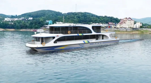 該客船(五島一村6號)由資興市五島一村水上旅游客運有限公司和中國船舶集團七一二所合作建造。船長30米,寬7.2米,動力498千瓦,采用具有自主知識產權的高安全級鋰電池技術、高可靠性直流組網技術和高效永磁推進電機技術建造。經濟航速下最高里程可達110km,續航時間6小時,具有高環保性、高舒適性和低能耗、低噪音等特點。本項目的實施,是中國船舶集團七一二所在綠色智能新能源船舶領域的又一重要突破??痛A計今年10月份建成下水。