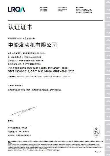 近日,中國船舶中船發動機收到勞盛質量認證(上海)有限公司發來的“三體系”證書,成功獲得LRQA“三體系”資質認證。