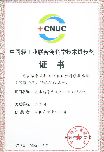 中國(guó)輕工業(yè)聯(lián)合會(huì)科學(xué)技術(shù)進(jìn)步獎(jiǎng)是中國(guó)輕工業(yè)聯(lián)合會(huì)設(shè)立的最高輕工科技獎(jiǎng)項(xiàng),屬于國(guó)家部級(jí)科技獎(jiǎng)勵(lì),被認(rèn)為是輕工業(yè)的“榮譽(yù)勛章”。汽車(chē)起停系統(tǒng)用EFB電池項(xiàng)目獲得該項(xiàng)榮譽(yù),是對(duì)風(fēng)帆技術(shù)研發(fā)實(shí)力的充分肯定。