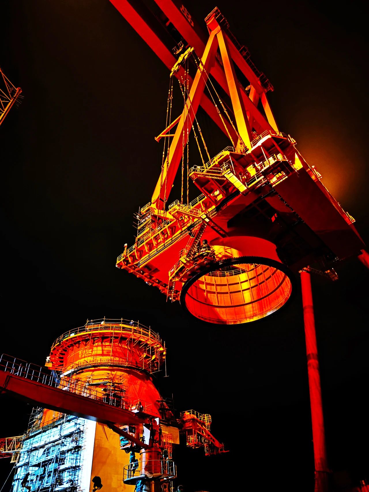 在武漢船機(jī)平臺總裝現(xiàn)場,華夏金租神大平臺配套的1200噸起重機(jī)正在安裝,大件吊裝各項(xiàng)準(zhǔn)備工作繁瑣,一切就緒時,天已經(jīng)黑了,現(xiàn)場一鼓作氣開始吊裝對接,展現(xiàn)了船舶人只爭朝夕、不負(fù)韶華、忘我工作精神風(fēng)貌。
